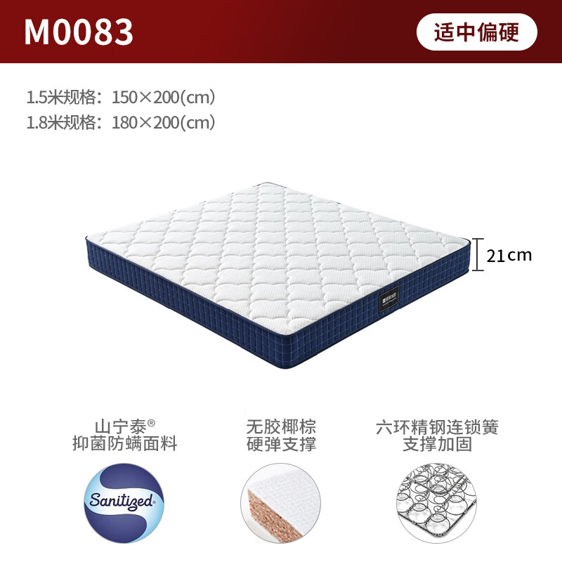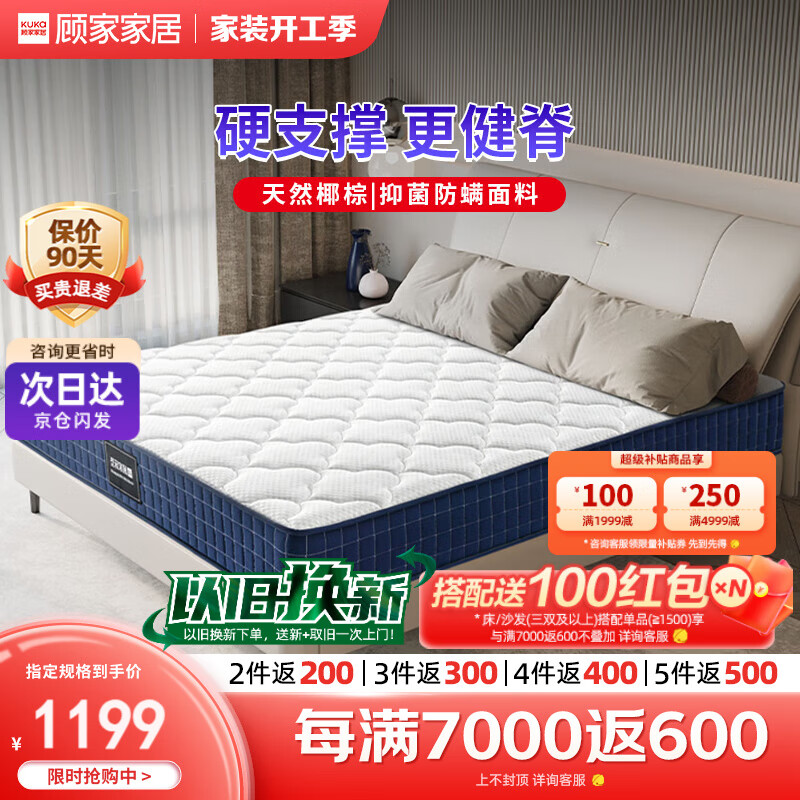 顾家家居椰棕抑菌防螨弹簧棕榈硬床垫宝石蓝席梦思M0083【京仓闪发】1.8*2价格:1198.00元!