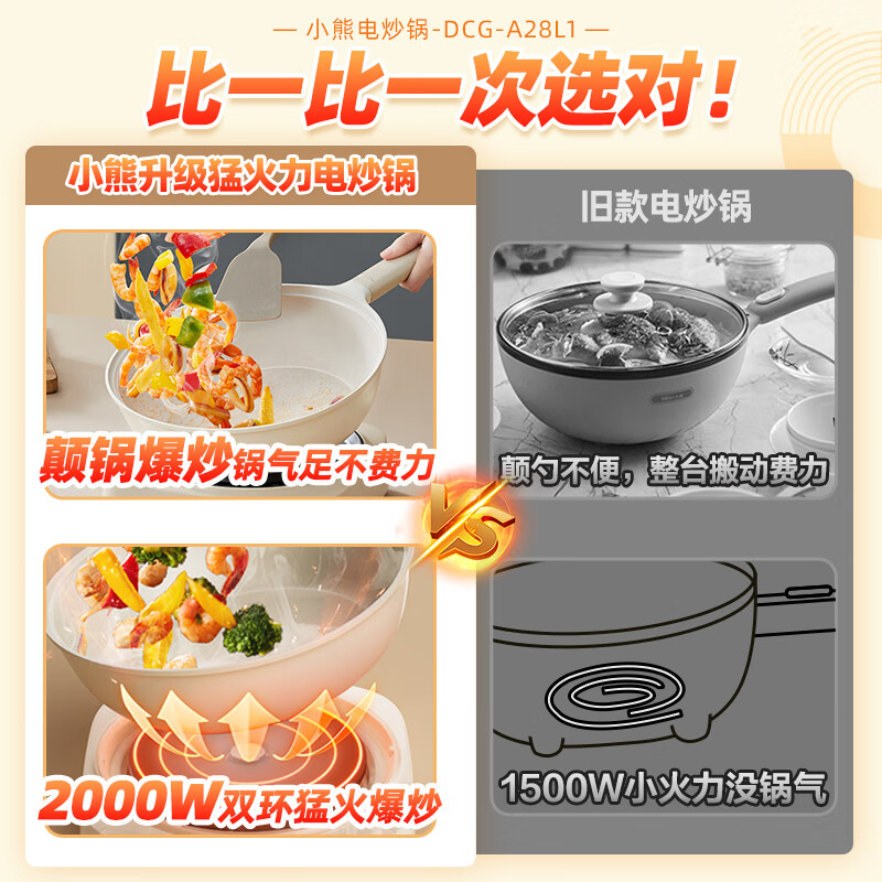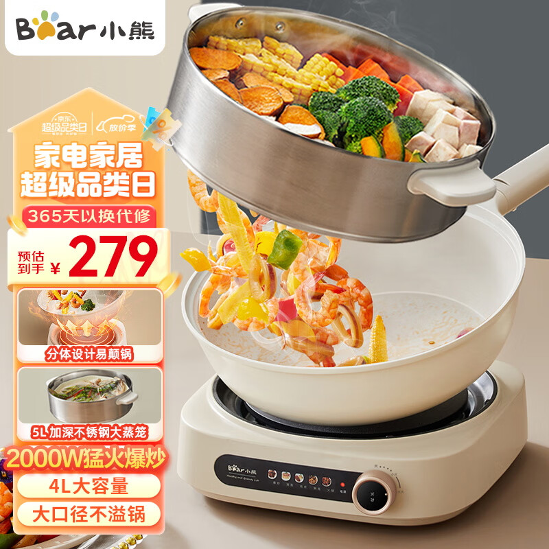 小熊(Bear)电炒锅 家用炒菜专用锅 电煮锅电蒸锅电火锅煎炒蒸煮不沾分体多功能大功率可颠锅爆炒4L DCG-A28L1价格:279.00元!