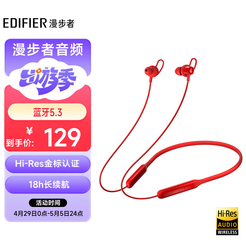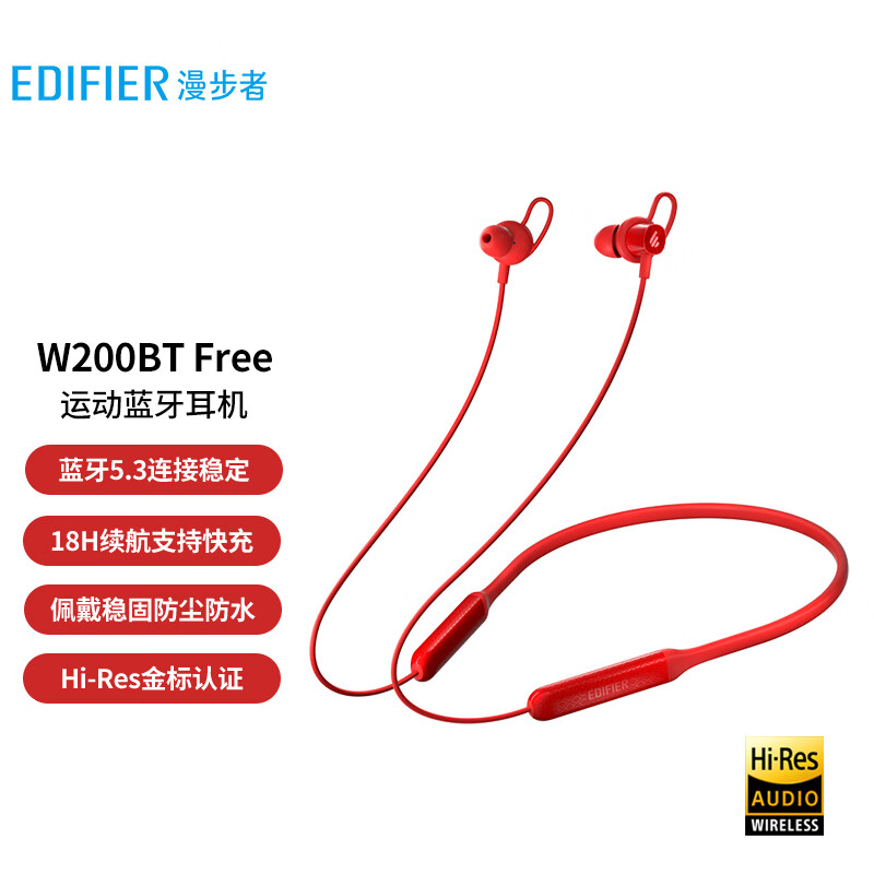 漫步者(EDIFIER)W200BT Free 颈挂式无线运动蓝牙耳机 蓝牙5.3 手机耳机 通话降噪耳机 红色价格:129.00元!