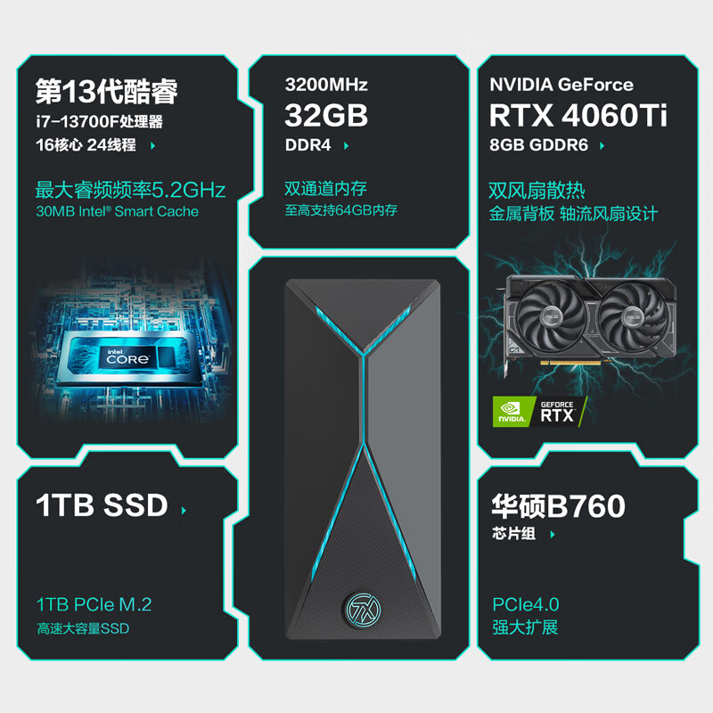 华硕天选X 游戏台式机电脑主机设计师电脑(13代i7-13700F RTX4060Ti 8G显卡 32G 1T SSD WiFi6)价格:8099.00元!