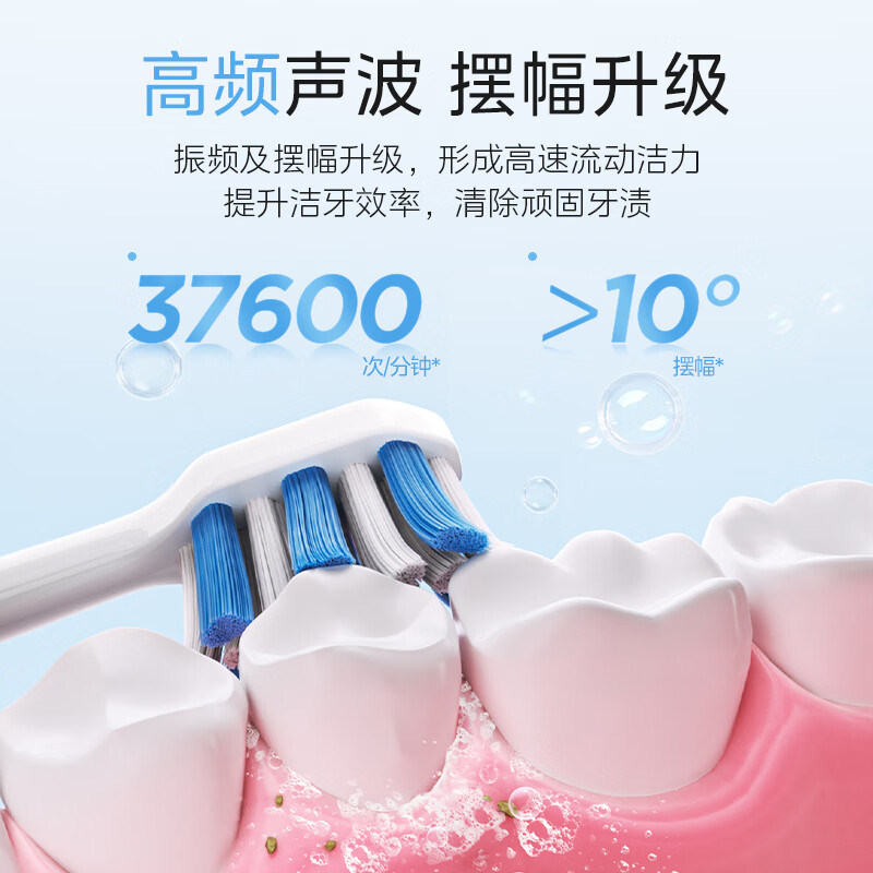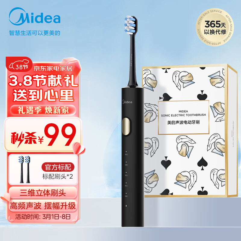 美的电动牙刷成人/学生 声波震动180天长续航智能换区提醒 软毛刷头*2 礼物 情侣款 YS7 黑价格:99.00元!