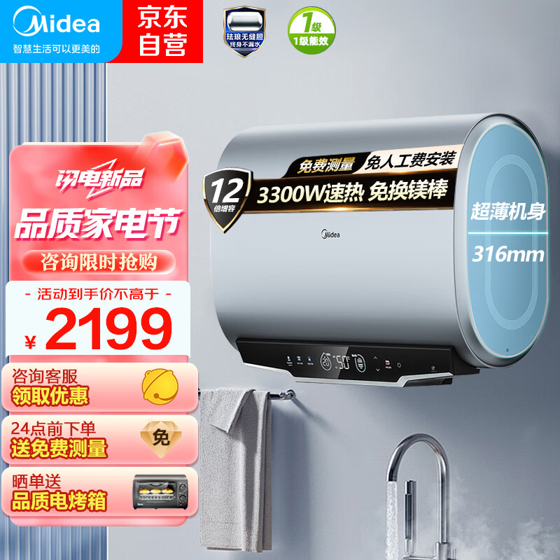 美的(Midea)扁桶电热水器储水式60升家用双胆变频加热速热即热式镁棒免更换一级能效上门安装F6033-UM(HE)价格:2199.00元!