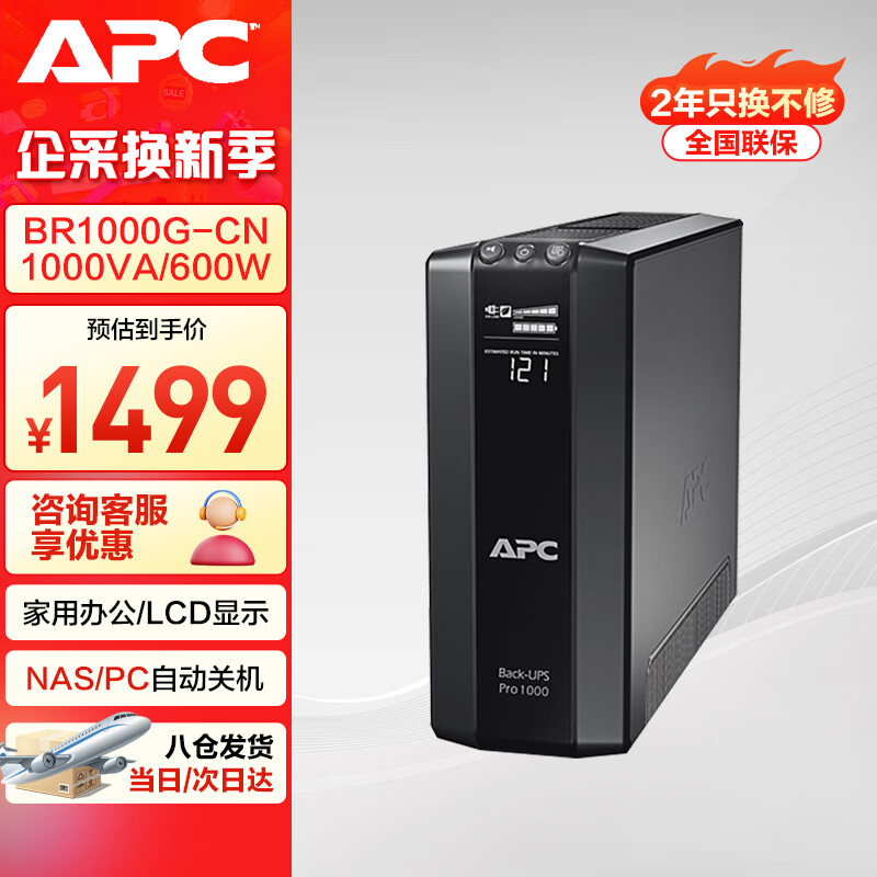 APC施耐德ups不间断电源BR1000G-CN 600W/1KVA nas电脑网络设备商务办公停电稳压应急备用ups电源价格:1499.00元!