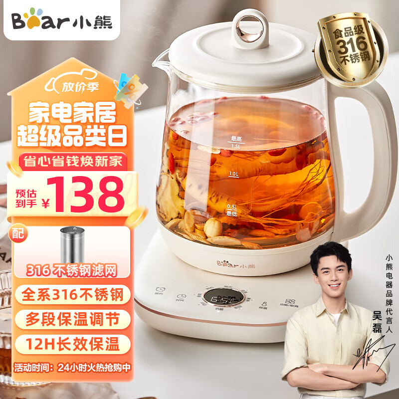 小熊(Bear)养生壶 1.5L煮茶壶煮茶器 玻璃花茶壶 316不锈钢恒温水壶烧水壶电热水壶 YSH-E15M1价格:138.00元!