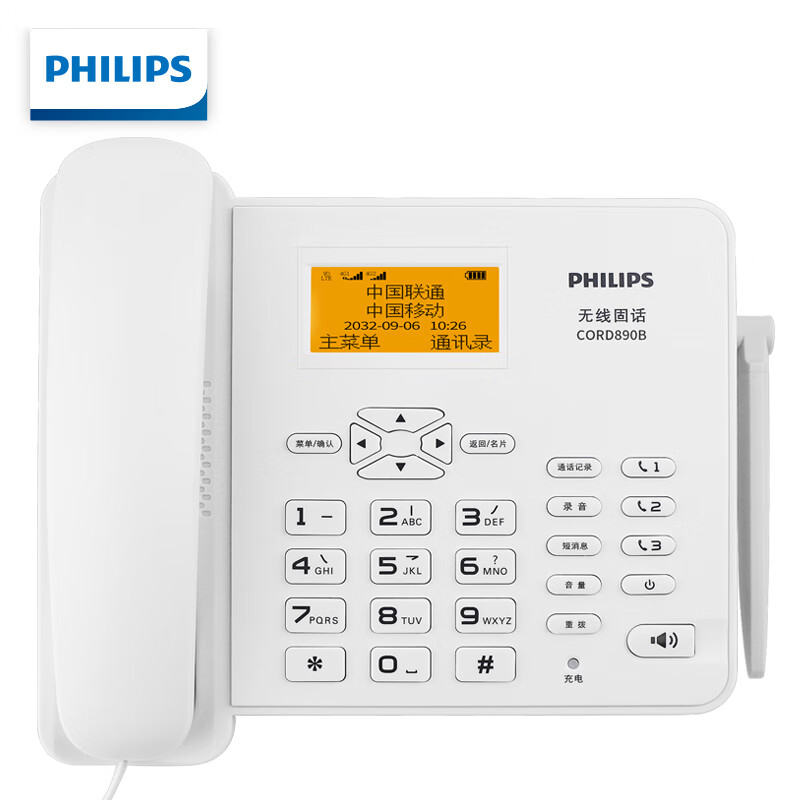 飞利浦(PHILIPS)无线插卡电话座机通4G可录音移动联通电信家用办公固话CORD890B 白色价格:299.00元!