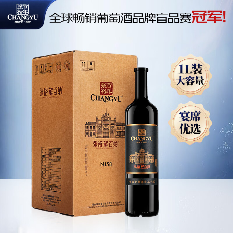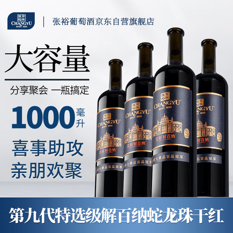 张裕(CHANGYU) 第九代特选级解百纳蛇龙珠干红1L大酒纪念版*4瓶整箱红酒送礼价格:640.00元!