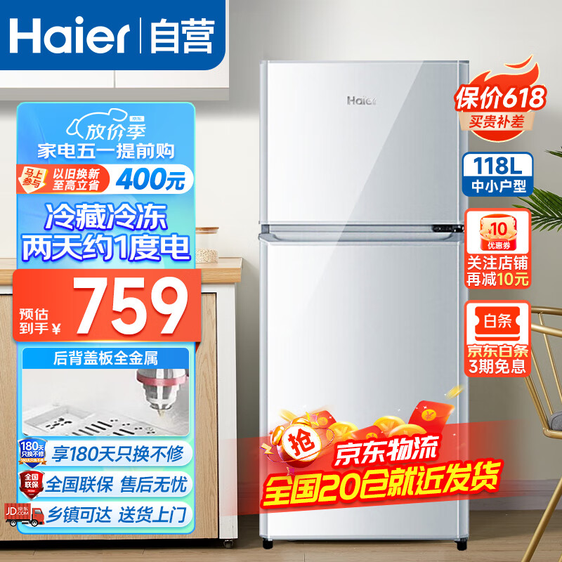 海尔(Haier)冰箱118升小型两门迷你双门冰箱宿舍家用租房小巧不占地节能省电冷藏冷冻电冰箱价格:799.00元!