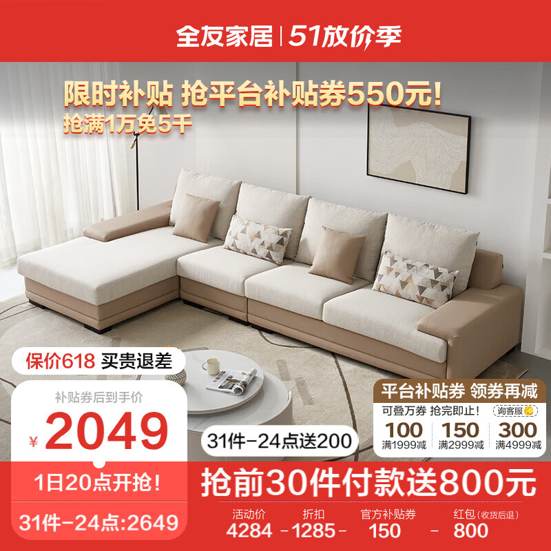 全友家居 现代简约布艺沙发家用大户型客厅实木架贵妃转角沙发102085价格:4284.29元!
