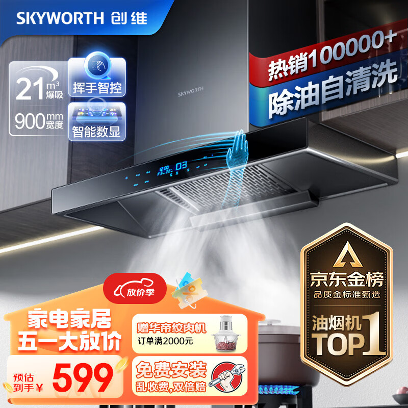 创维(Skyworth)油烟机 欧式顶吸式吸油烟机家用 T型爆炒大吸力抽油烟机 自清洗挥手体感触控 黑色 Y1H价格:599.00元!