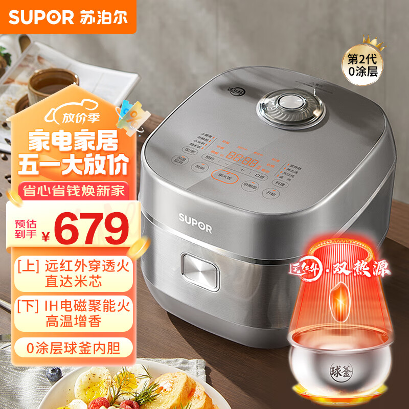 苏泊尔(SUPOR)电饭煲家用5-8个人0涂层电饭煲4L远红外球釜内胆 IH加热智能无涂层电饭煲SF40HC0988价格:648.00元!