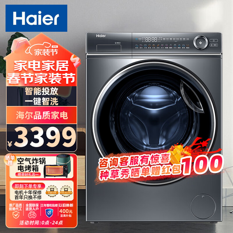 海尔(Haier)【精华洗2.0】10公斤滚筒洗衣机直驱变频家用全自动一级能效一键智洗智能投放除菌EG100BD66S价格:3399.00元!