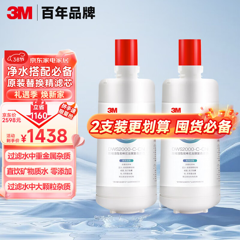 3M净水器家用净水机DWS2000CN型原装替换滤芯两只装(本品*1+附件*1共计两只)价格:1598.00元!