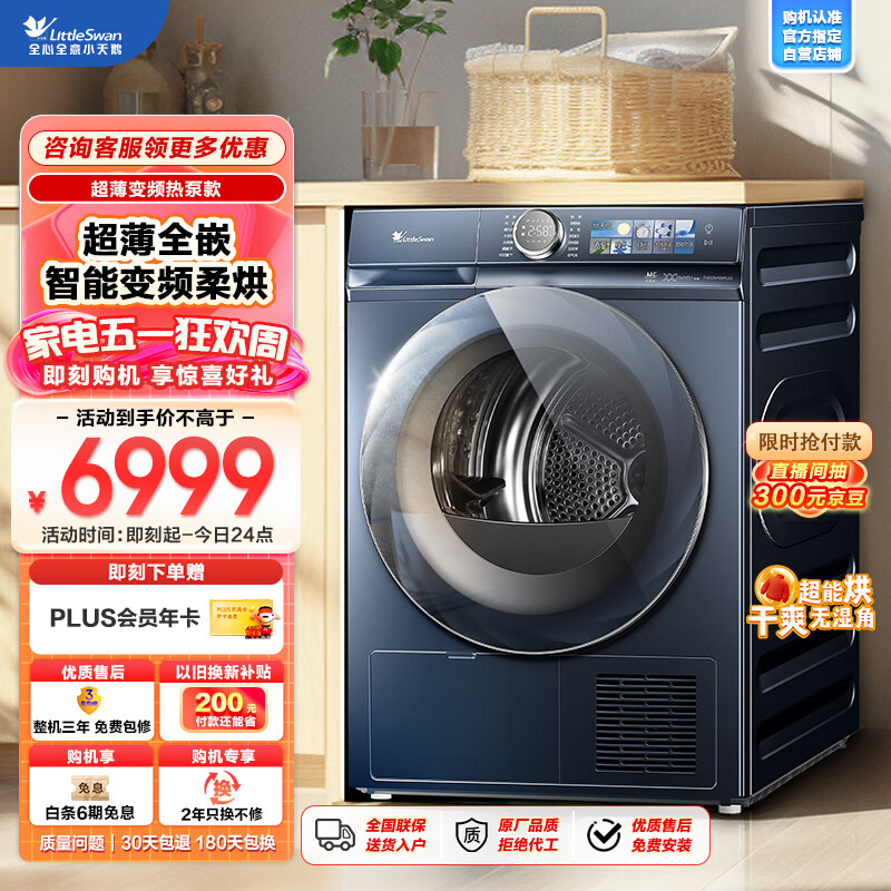 小天鹅(LittleSwan)10KG热泵烘干机 干衣机家用 变频大风量 超薄全嵌 羊毛蓝标 多重毛屑过滤 TH100VH88PLUS价格:6999.00元!