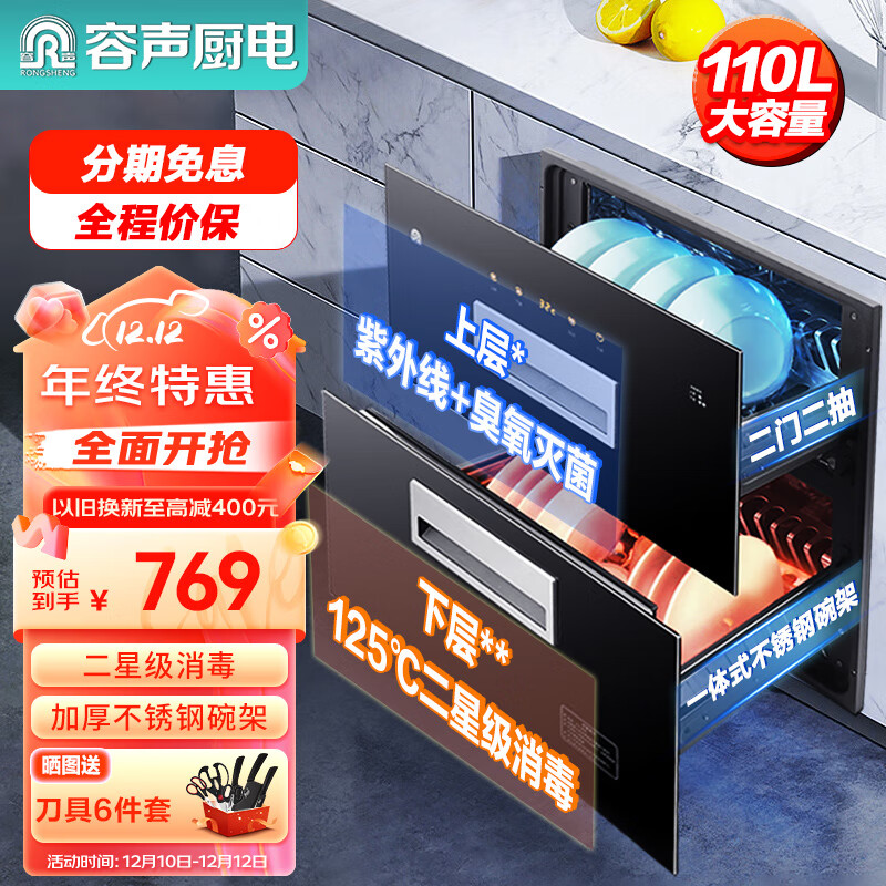 容声(RONGSHENG)二层二星 消毒柜 嵌入式 家用 消毒碗柜 高温 臭氧 厨房碗筷消毒柜 110L大容量RX02F(A)价格:769.00元!