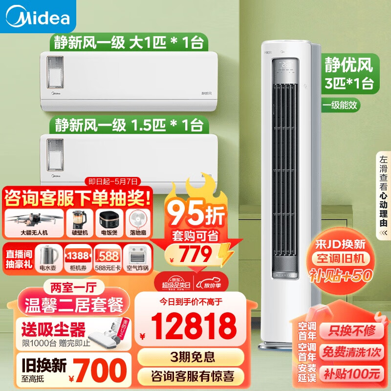 美的(Midea)静新风+静优风空调温馨两居套餐(1.5匹静新风*1+1匹静新风*1+3匹静优风柜机)一站购齐套购价格:13597.00元!