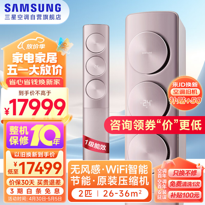 三星2匹空调新一级能效全直流变频WIFI无风感圆柱除菌冷暖立式柜机 26-36㎡适用以旧换新KFR-50L/EBA1价格:18999.00元!