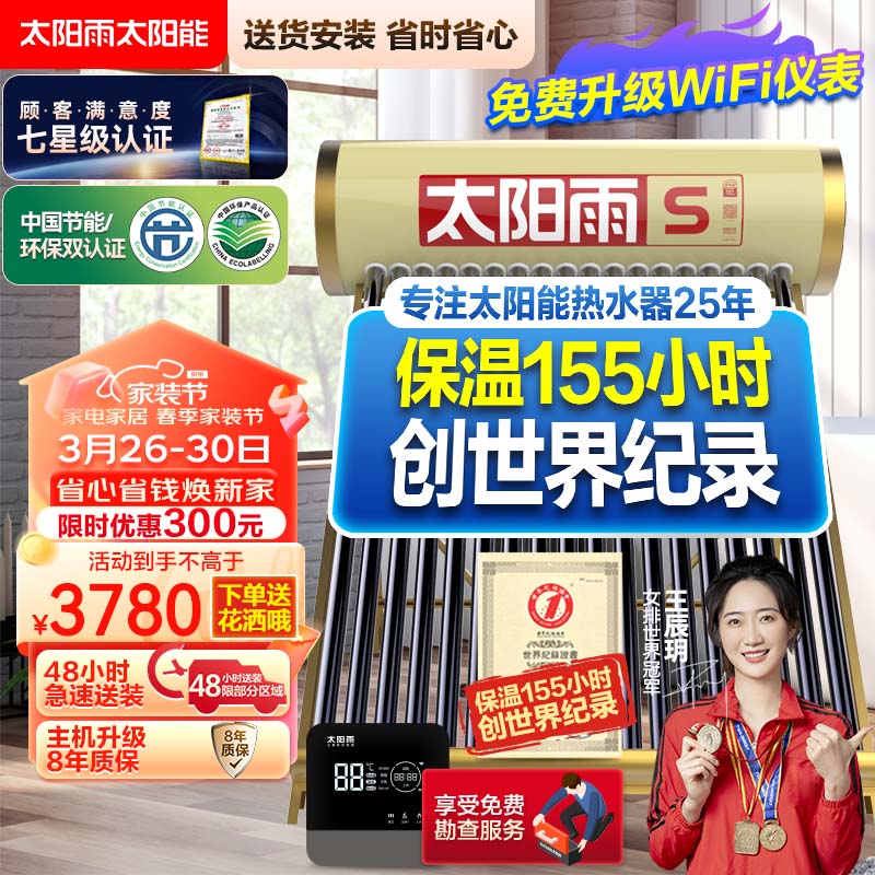 太阳雨太阳能热水器家用升级大水箱175升 全自动上水 光电两用 配智能仪表电加热 S金系列20管价格:4080.00元!