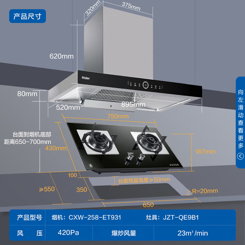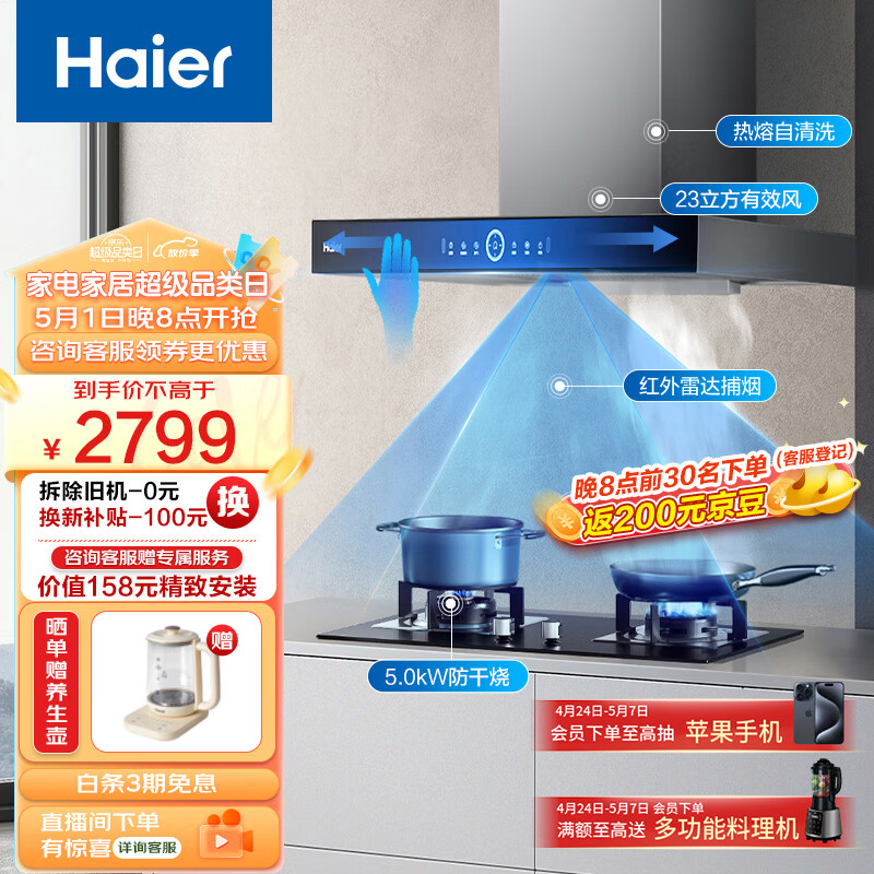 海尔(Haier)抽油烟机 顶吸欧式烟灶套装 23m3/min 挥手智控 5.0KW防干烧灶 油烟机灶具套装ET931+QE9B1(天)价格:2799.00元!