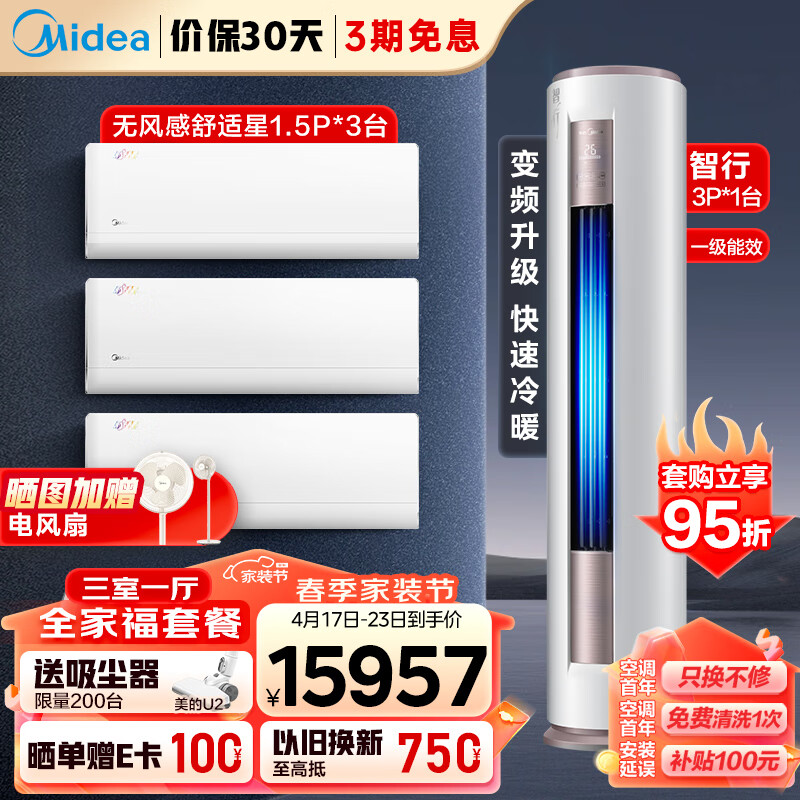 美的(Midea)空调套装 新一级能效 大三室一厅(1.5匹舒适星一级挂机*3+3匹智行柜机一级)一套购齐价格:16796.00元!