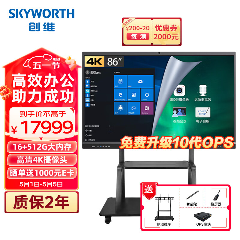 创维(Skyworth)86英寸会议平板智能触摸一体机电子白板无线投屏视频会议内置8阵列麦克风86MBK7双系统I7推车价格:22199.00元!