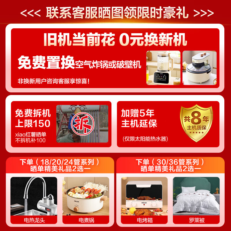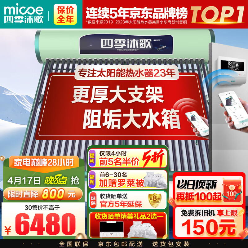四季沐歌(MICOE)飞天豪华WiFi太阳能热水器家用光电两用自动上水 预约电加热 水温水位显示 带阻垢 大容量30管255L价格:7280.00元!