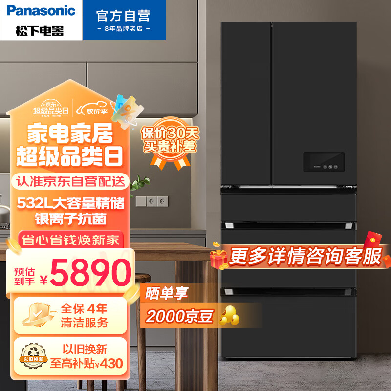 松下(Panasonic)532升家用大容量多门冰箱 不串味 变频无霜风冷NR-EE53WGB-K炫墨黑高端款价格:6490.00元!