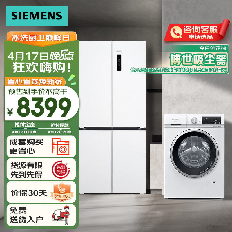 西门子(SIEMENS)冰洗套装497L超薄微平嵌十字星冰箱+10kg洗烘一体KC502080EC+WN52A1004W价格:8499.00元!