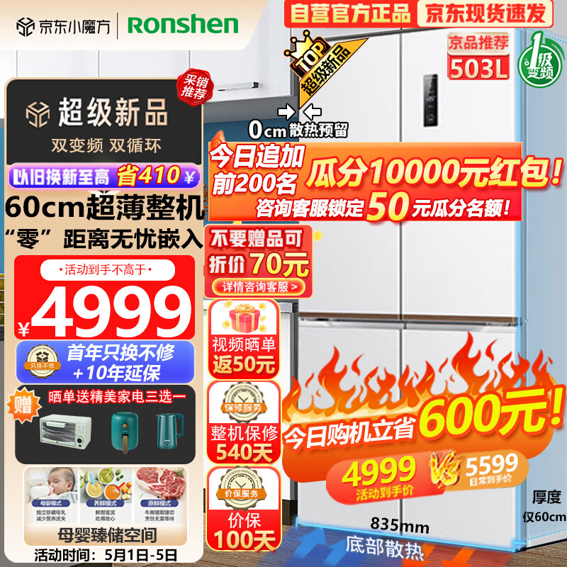 容声(Ronshen)60厘米薄零嵌入式503升十字对开四开门冰箱家用一级能效变频底部散热超薄大容量BCD-503WD1FPQ价格:5599.00元!