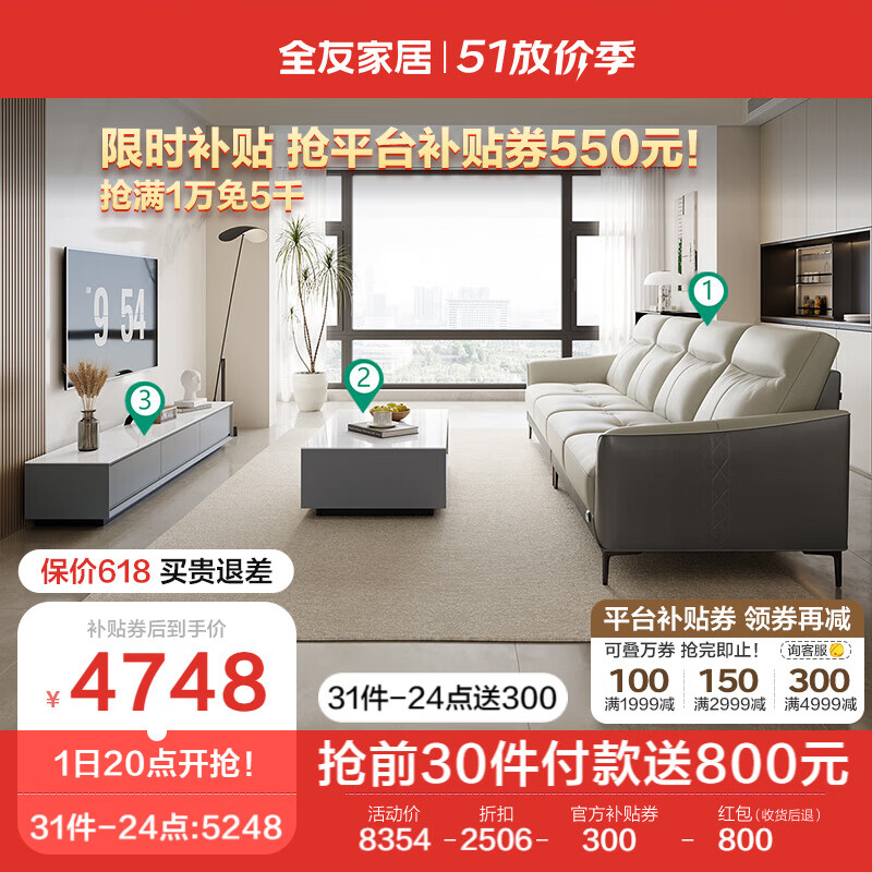 全友家居 简约客厅3件套装102710皮沙发岩板茶几电视柜主柜客厅家具价格:8354.29元!