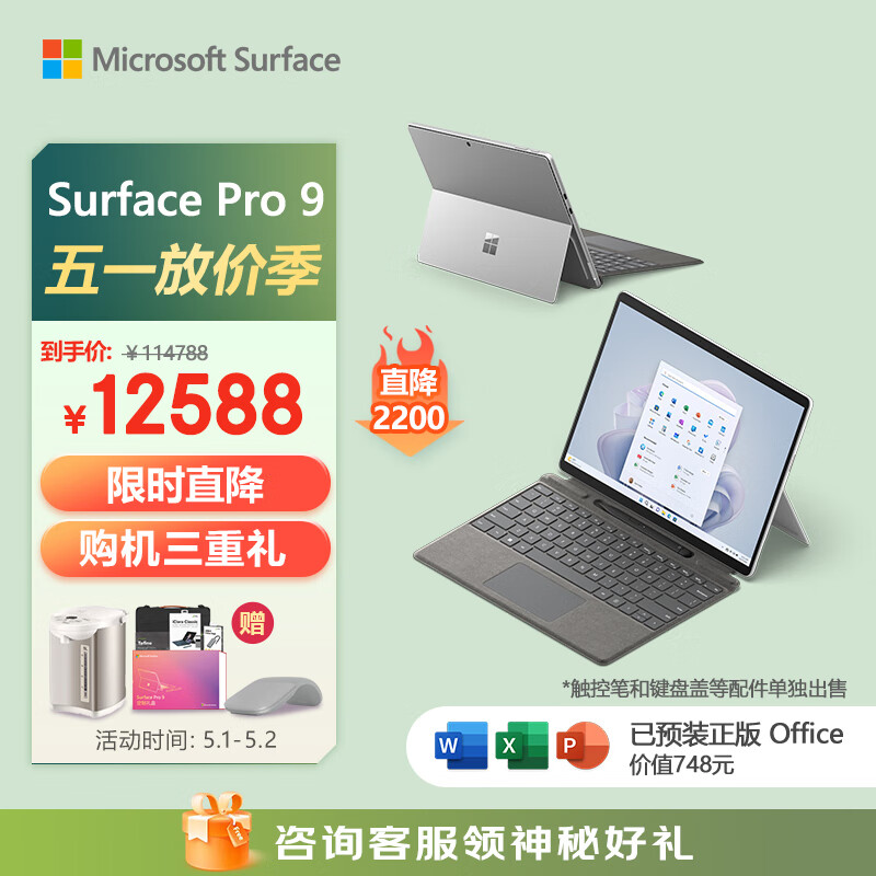 微软Surface Pro 9二合一平板电脑i7/16G/512G亮铂金 13英寸高刷触控 教育学习机 高端办公 笔记本电脑价格:12588.00元!