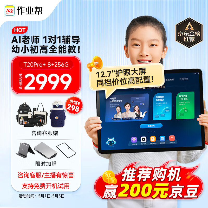 作业帮AI学习机T20Pro+ 学习机平板小学到高中全科作业辅导精准学 赠80万元学习资源 家教机12.7''8+256G价格:2999.00元!