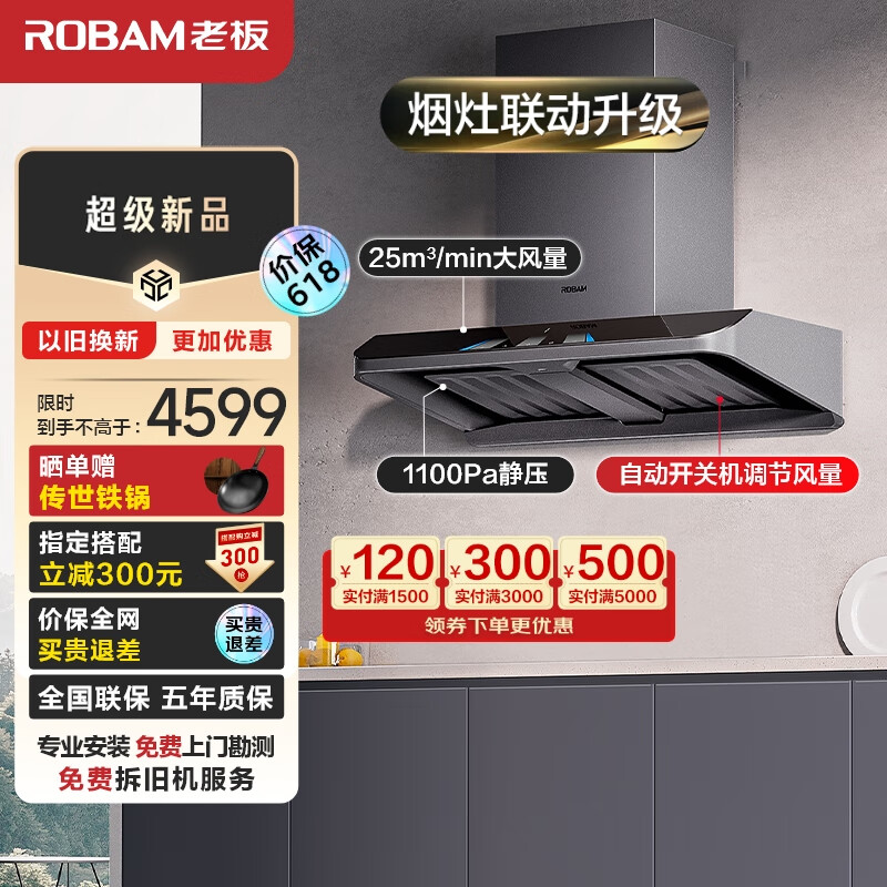 老板(Robam)【灵犀烟灶联动升级】抽油烟机智能变频25风量欧式顶吸式双腔油烟机家用大吸力吸油烟机63A3S烟机价格:4599.00元!