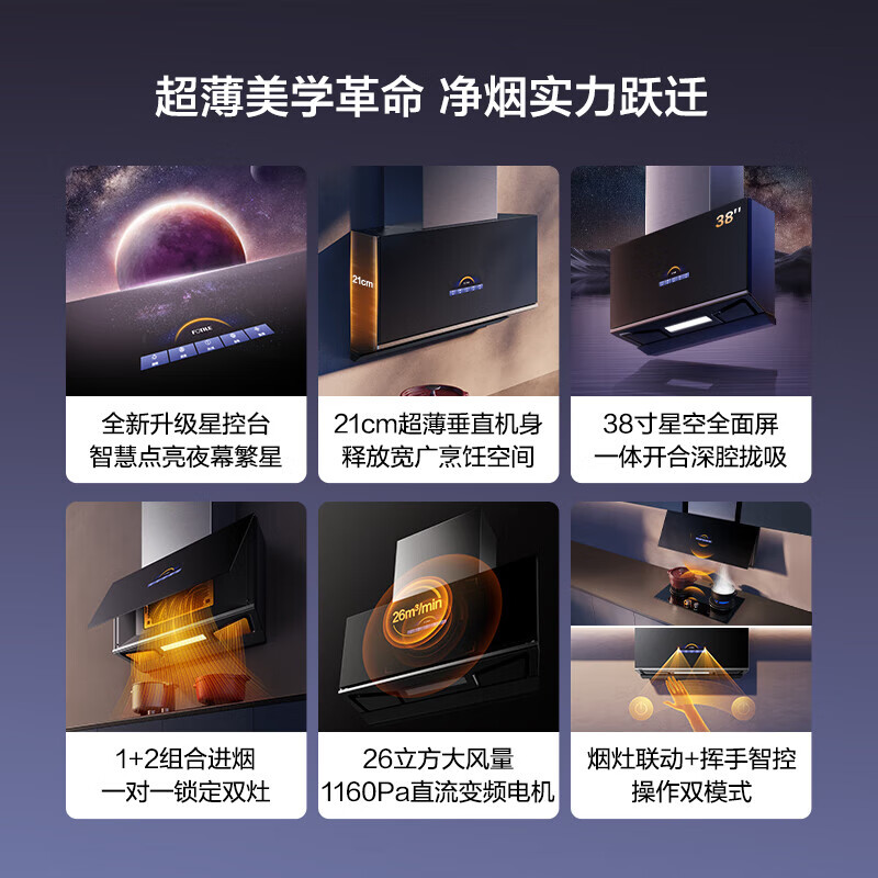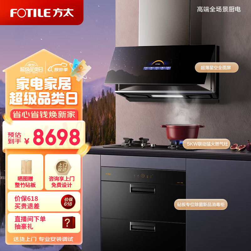 方太(FOTILE)烟灶消三件套 26风量超薄近吸变频烟机 5KW灶 砧板专位除菌智控嵌入式消毒柜P10.I+THF1A+J45EX.I价格:8698.00元!