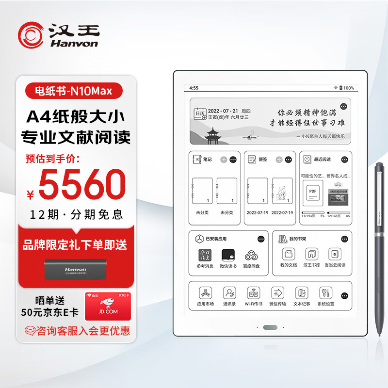 汉王N10Max2024款 电纸书13.3英寸微信读书阅读器专业文献PDF护眼阅览器水墨墨水屏平板办公手写记事本价格:5560.00元!