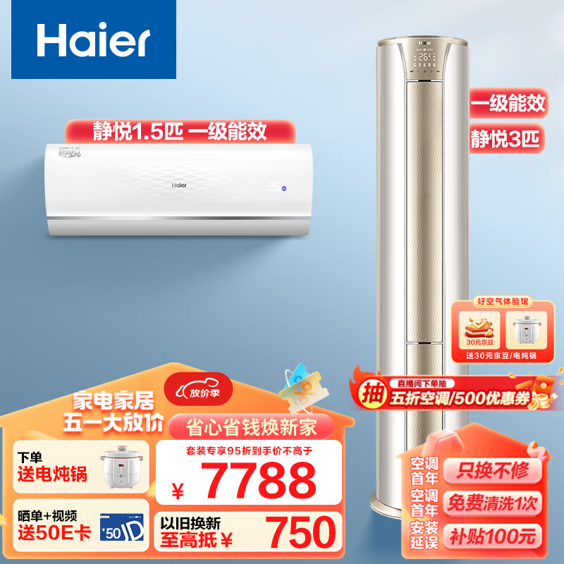 海尔(Haier)空调 套装一室一厅(1.5匹静悦一级挂机+3匹静悦一级能效柜机)套购价格:7788.00元!