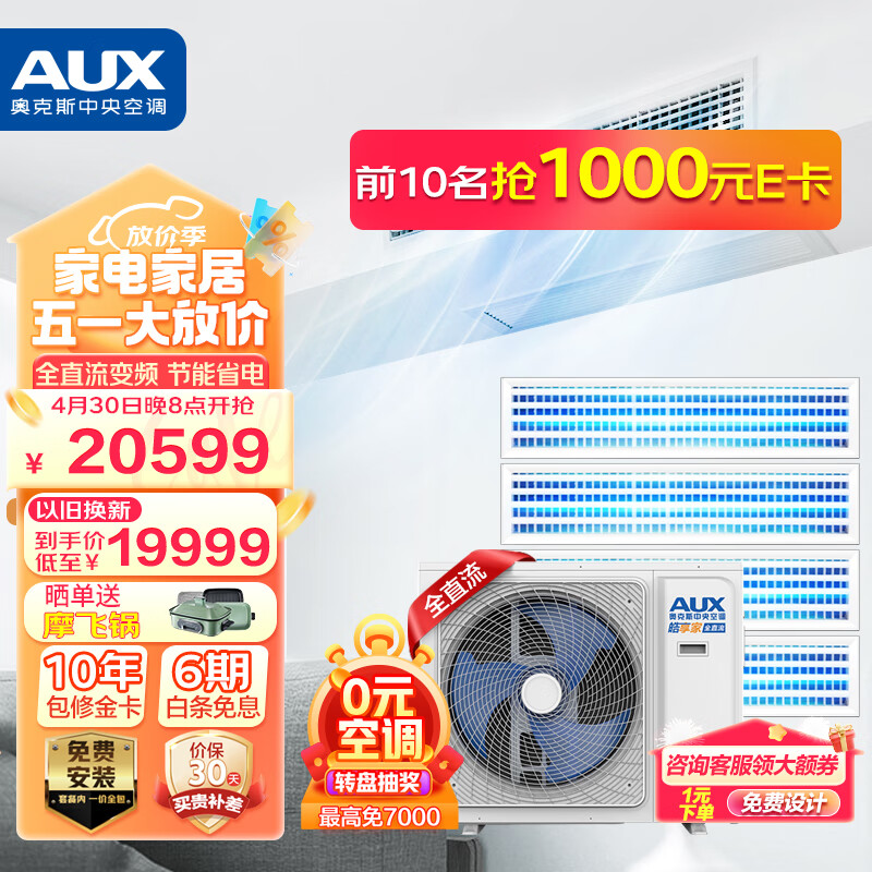 奥克斯(AUX)中央空调一拖四风管机空调多联机5匹一级能效全直流变频快速冷暖智能清洁嵌入式空调DLR-H120W(G1)价格:20599.00元!