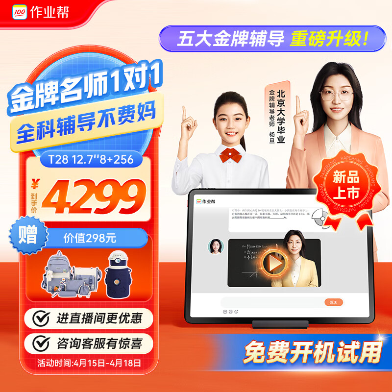 作业帮AI学习机T28金牌辅导1对1 小学到高中学习平板电脑家教机 教材同步学 类纸护眼屏12.7'' 8+256G价格:4299.00元!