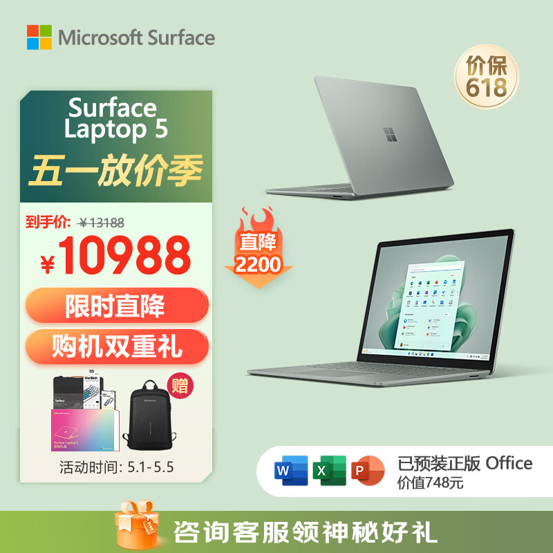 微软Surface Laptop 5 轻薄办公笔记本电脑 i7 16G+512G 仙茶绿 Evo认证 13.5英寸 2.2K高色域触控屏价格:10988.00元!