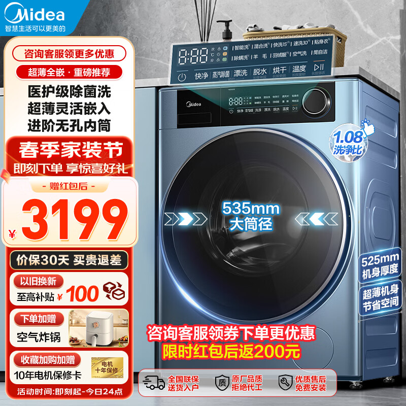 美的(Midea)滚筒洗衣机全自动家用10公斤大容量超薄全嵌医护级除真菌一级能效以旧换新S1价格:3199.00元!