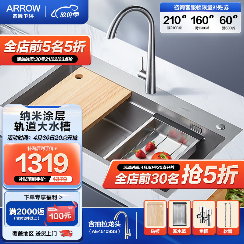 箭牌(ARROW)304不锈钢加厚轨道大单槽厨房洗碗洗菜盆AE5575424G31-NC纳米银价格:1429.00元!
