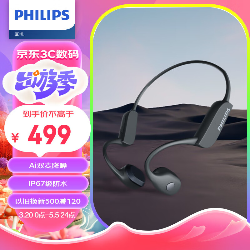 飞利浦(PHILIPS)骨传导耳机蓝牙开放式不入耳运动跑步健身骑行防水无线音乐超长续航挂耳式骨传感耳机 TAA3609黑色价格:499.00元!
