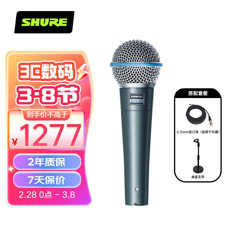 SHURE BETA 58A专业动圈有线话筒家用K歌直播舞台演出麦克风BETA58A+6.5卡农线(5米)+桌面支架价格:1277.00元!
