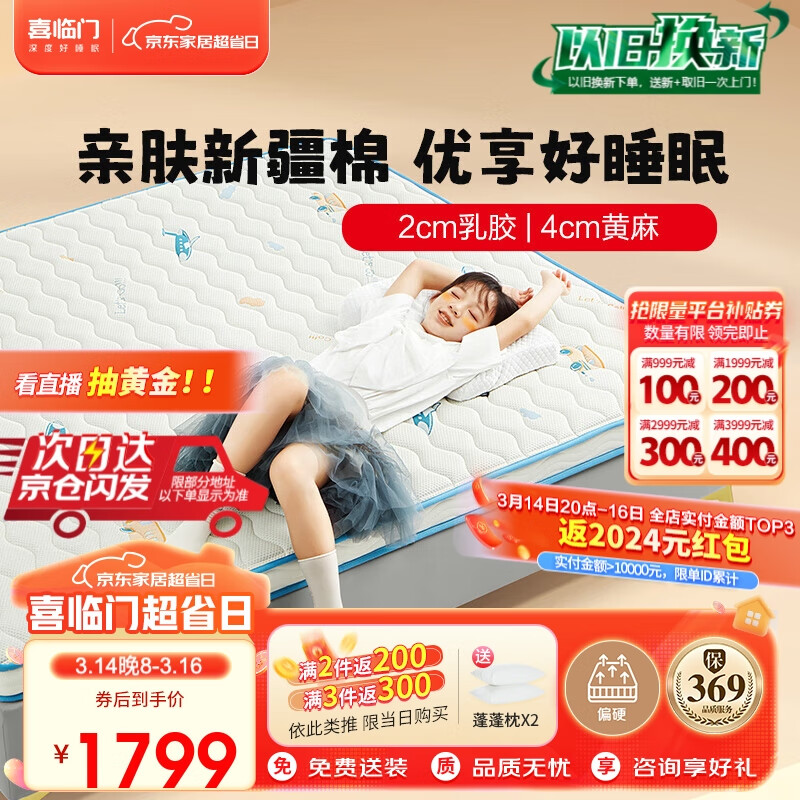 喜临门薄垫 2cm高纯乳胶 4cm黄麻床垫 青少年老人床垫 诺蓝10H 1.8*2.0m价格:1899.00元!