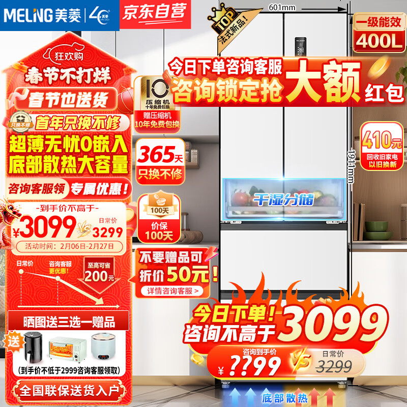 美菱(MeiLing)【无忧嵌】400升法式多门电冰箱家用一级能效零嵌入式冰箱超薄底部散热BCD-400WP9CZX雪域白价格:3299.00元!