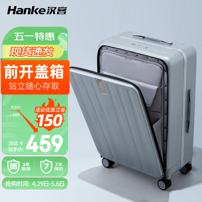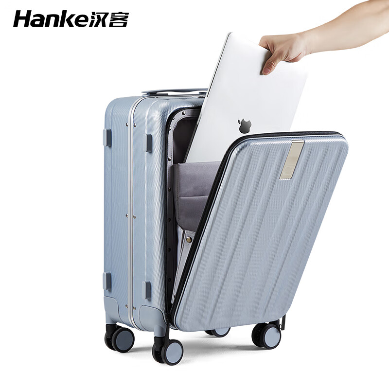 汉客铝框前开盖登机行李箱男20英寸环保灰铝框拉杆箱女密码箱旅行箱价格:609.00元!