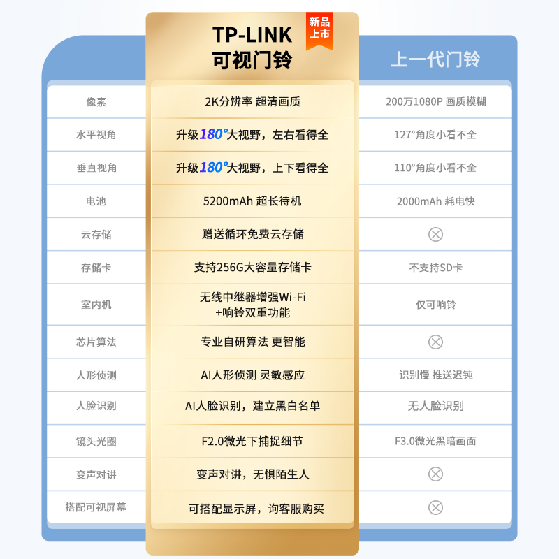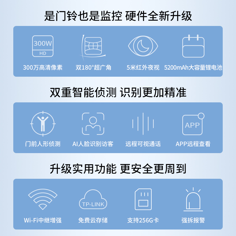 TP-link 可视门铃摄像头家用监控智能摄像机电子猫眼智能门铃无线wifi访客识别视频通话超清夜视DB53A新版价格:739.00元!