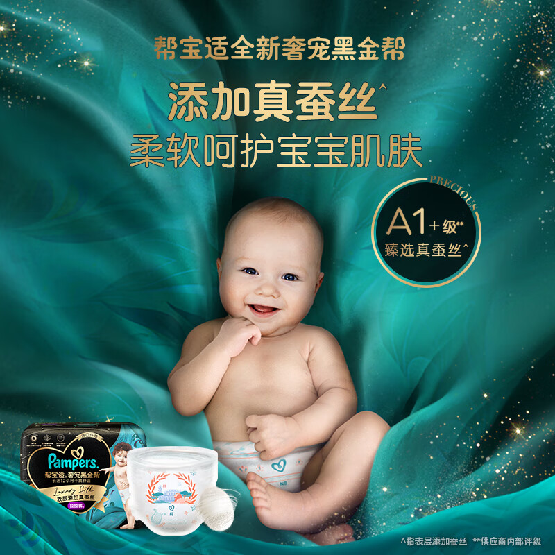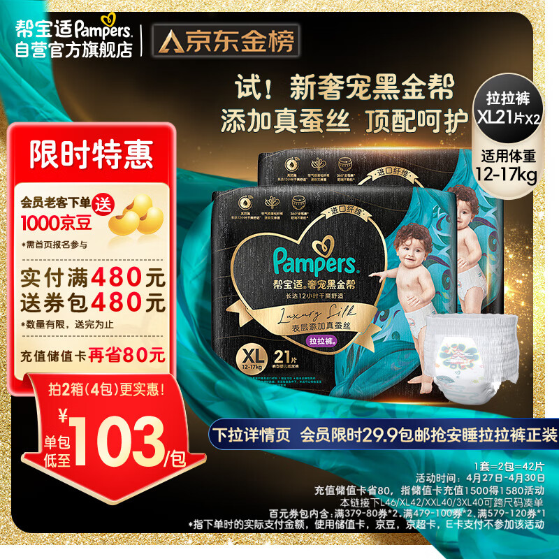 帮宝适黑金帮拉拉裤XL42片(12-17kg)加大码尿裤尿不湿蚕丝 超薄透气价格:232.90元!