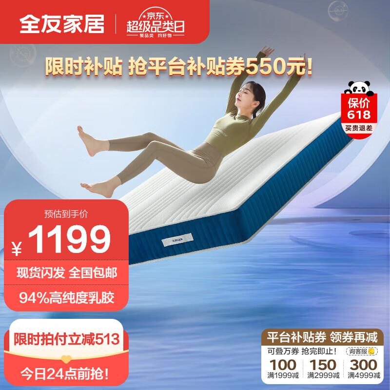 全友家居 床垫防螨抑菌进口乳胶床垫独立袋装弹簧卧室家用厚床垫105325 Ⅲ床垫(1.8*2.0)价格:1712.86元!