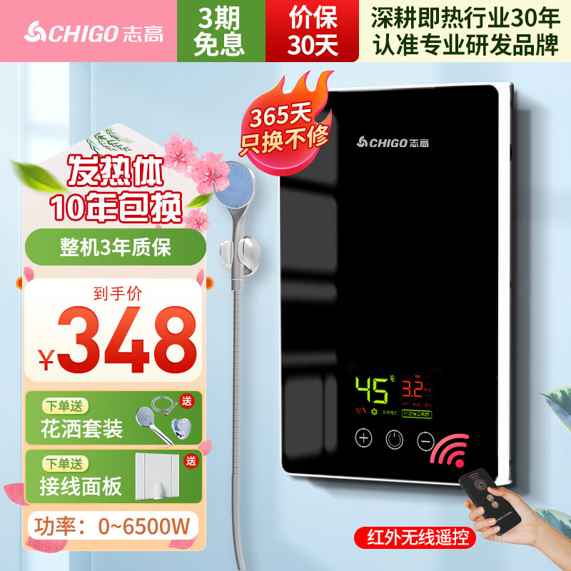 志高(CHIGO)即热式电热水器6500W速热集成 小厨宝即热热水器免储水多功率可调防漏电KBR-B65 遥控款价格:348.00元!