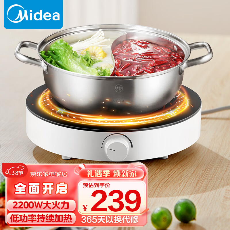 美的(Midea)电磁炉 2200W大功率家用爆炒电磁炉 C22-RX22H0107+火锅鸳鸯锅TG28S09价格:239.00元!